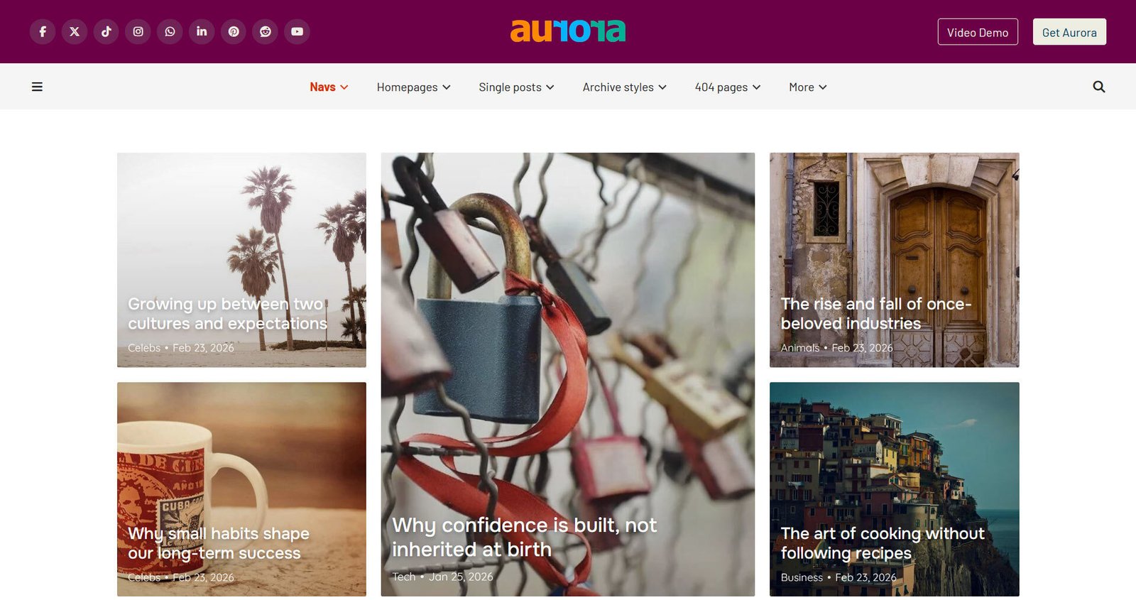 Aurora’s homepages aren’t rigid templates. Each of the five layouts comes with four configurable content sections, so you can decide what appears in each spot, from featured posts to category grids to custom content blocks. This gives you the kind of homepage control that usually requires a page builder.